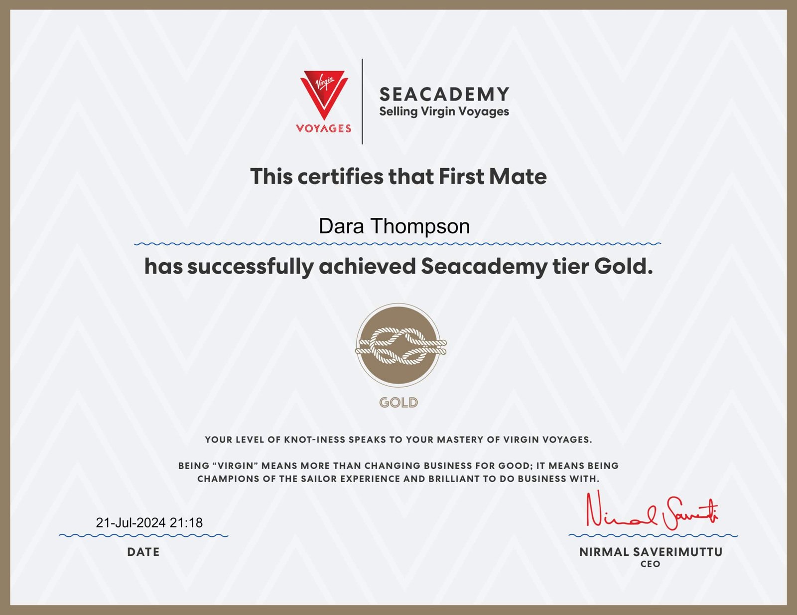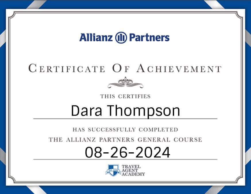 The Certified Travel Associate, CTA, designation is awarded by The Travel Institute to travel professionals who have been in the industry for at least a year and those who complete a rigorous training program, including a closed-book, proctored exam. This certificate demonstrates my commitment to life-long learning but also a commitment as a travel advisor to my clients who will be better served because of my increased knowledge and experience.